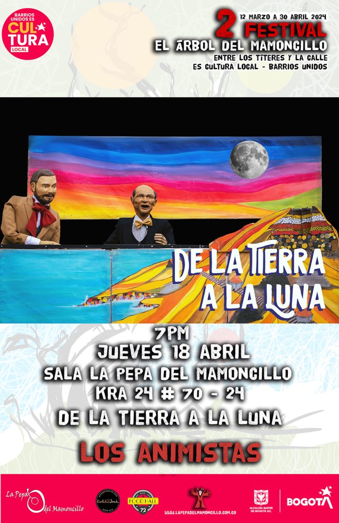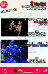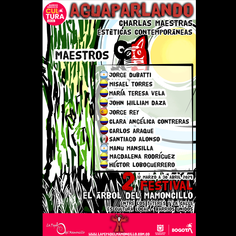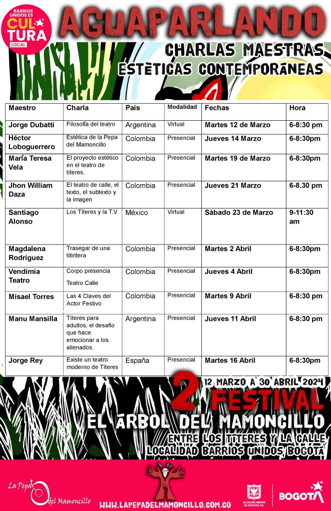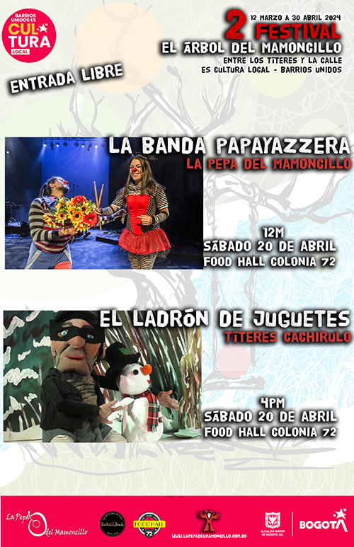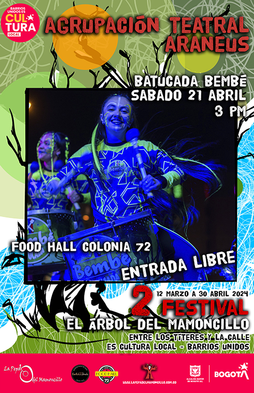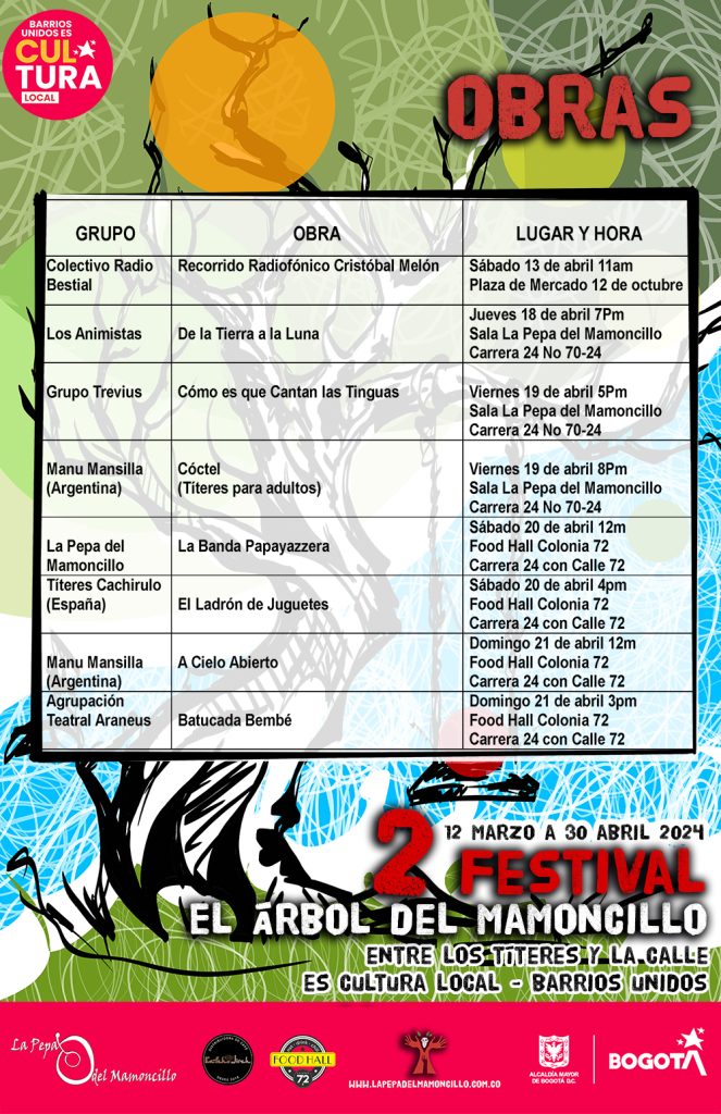 2do Festival el Árbol del Mamoncillo, una gran fiesta del teatro de calle y de los títeres en Bogotá, una invitación al convivio a la reflexión creadora. 8 funciones para toda la familia, 10 charlas magistrales, la publicación y edición de una revista virtual que posibilite el diálogo creador de los artistas profesionales en el ámbito del teatro, 2 artistas internacionales, invitados especialmente para compartir sus experiencias, técnicas, estéticas y mucho más del 12 de marzo al 30 de abril en la localidad de Barrios Unidos 2024.